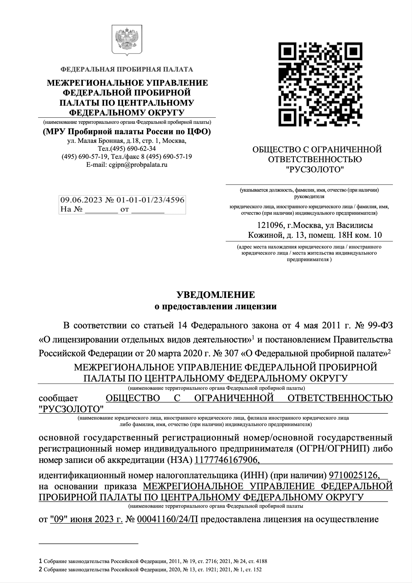 Лицензия на осуществление деятельности по обработке (переработке) лома и отходов драгоценных металлов
